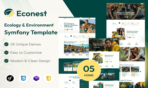 บริการรีไซเคิล และกิจกรรมที่เป็นมิตรต่อสิ่งแวดล้อมอื่นๆ เทมเพลต Econest มีเลย์เอาต์ที่ตอบสนองต่อทุกขนาดหน้าจออย่างสมบูรณ์