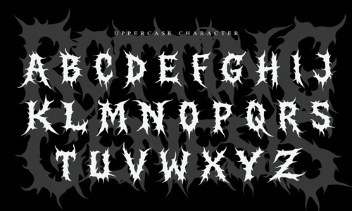 รูปทรงตัวอักษรที่หนาแน่นและสอดประสานกันให้ความรู้สึกถึงพลังอันดิบเถื่อนและความมืดมน