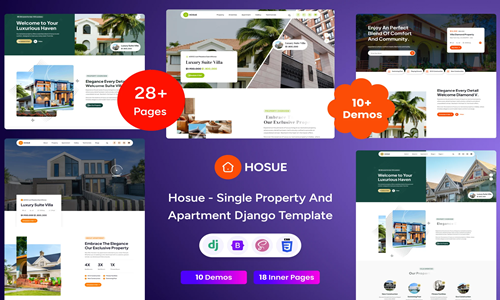 Hosue – เทมเพลต Django สำหรับอสังหาริมทรัพย์และอพาร์ตเมนต์แบบเดี่ยวเป็นโซลูชันระดับพรีเมียมและทันสมัยที่ออกแบบมาเพื่อแสดงอสังหาริมทรัพย์แบบเดี่ยวอย่างมีสไตล์และแม่นยำ
